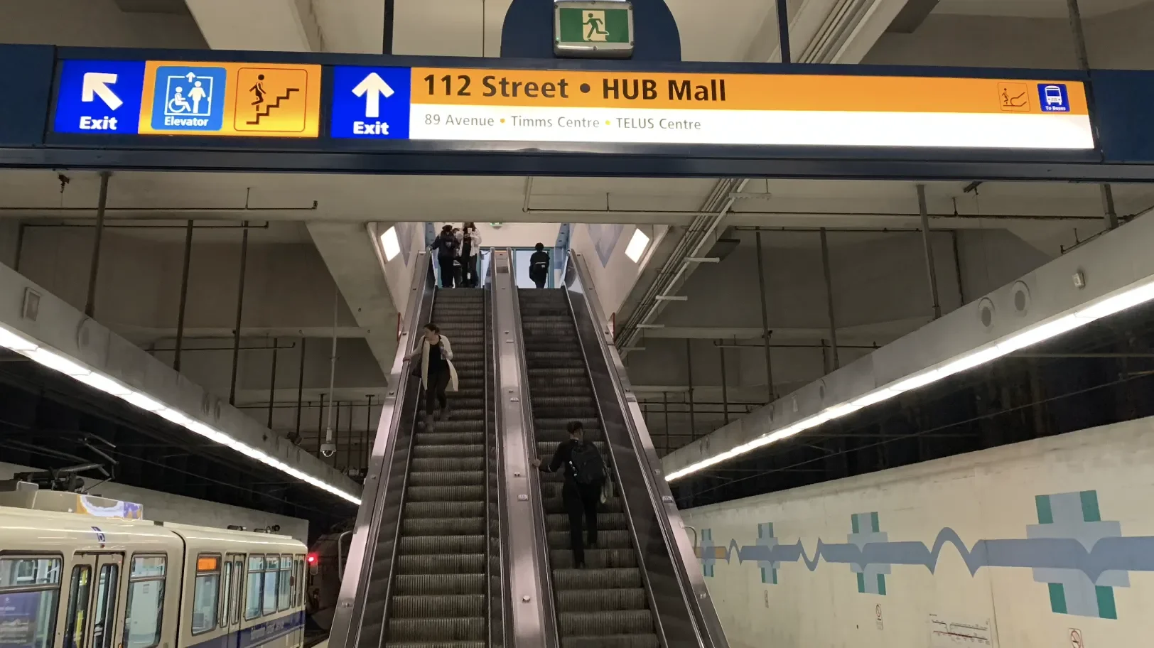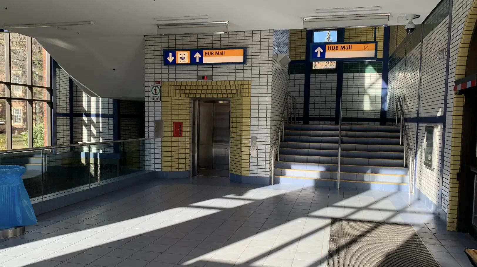 Once at University Station, follow the yellow and blue ceiling signs up to HUB Mall. You’ll have to take several stairs/escalators. Follow the signs all the way until you reach the pedway entrance to HUB Mall.